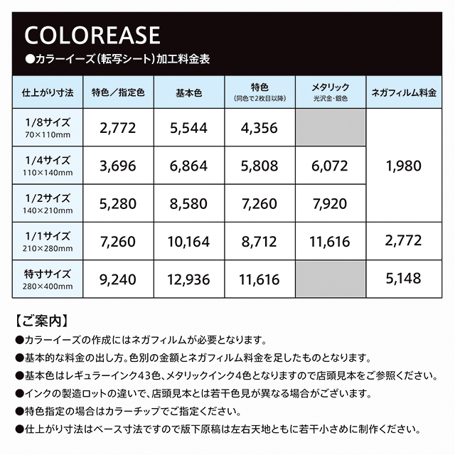 また、インク色については『カラーイーズ色見本』をご確認ください。